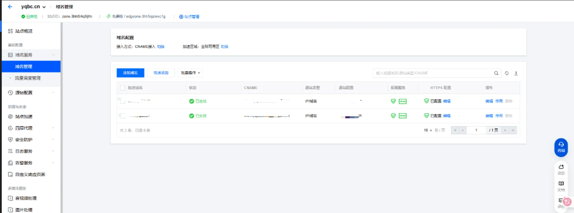 进入EdgeOne的控制台,点击新增站点。输入你的域名,然后验证所有权。然后添加加速域名。
